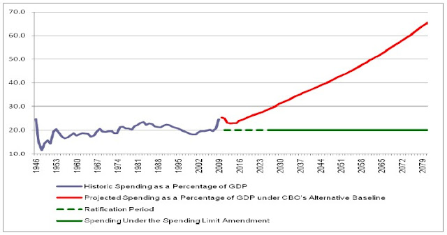The Spending Limit Amendment (SLA) to the Constitution of the United States would ensure that federal spending cannot grow faster than a family’s ability to pay for it. The Amendment would limit spending to one-fifth of the economy—the historical average for spending since World War II. The limit could only be waived if a declaration of war was in effect or by a two-thirds vote of Congress.